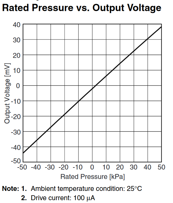 This sensor requires a 100uA constant current source to power it, and offers an output voltage ranging from approximatly -45 to 38mV, and so requires external amplification from an instrumentation amplifier.